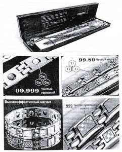 Состав браслета: более сотни миллионов микрошаров, состоящих из церия, германия, титана, бронзы и железа. Не имеет никаких побочных эффектов для человеческого организма.